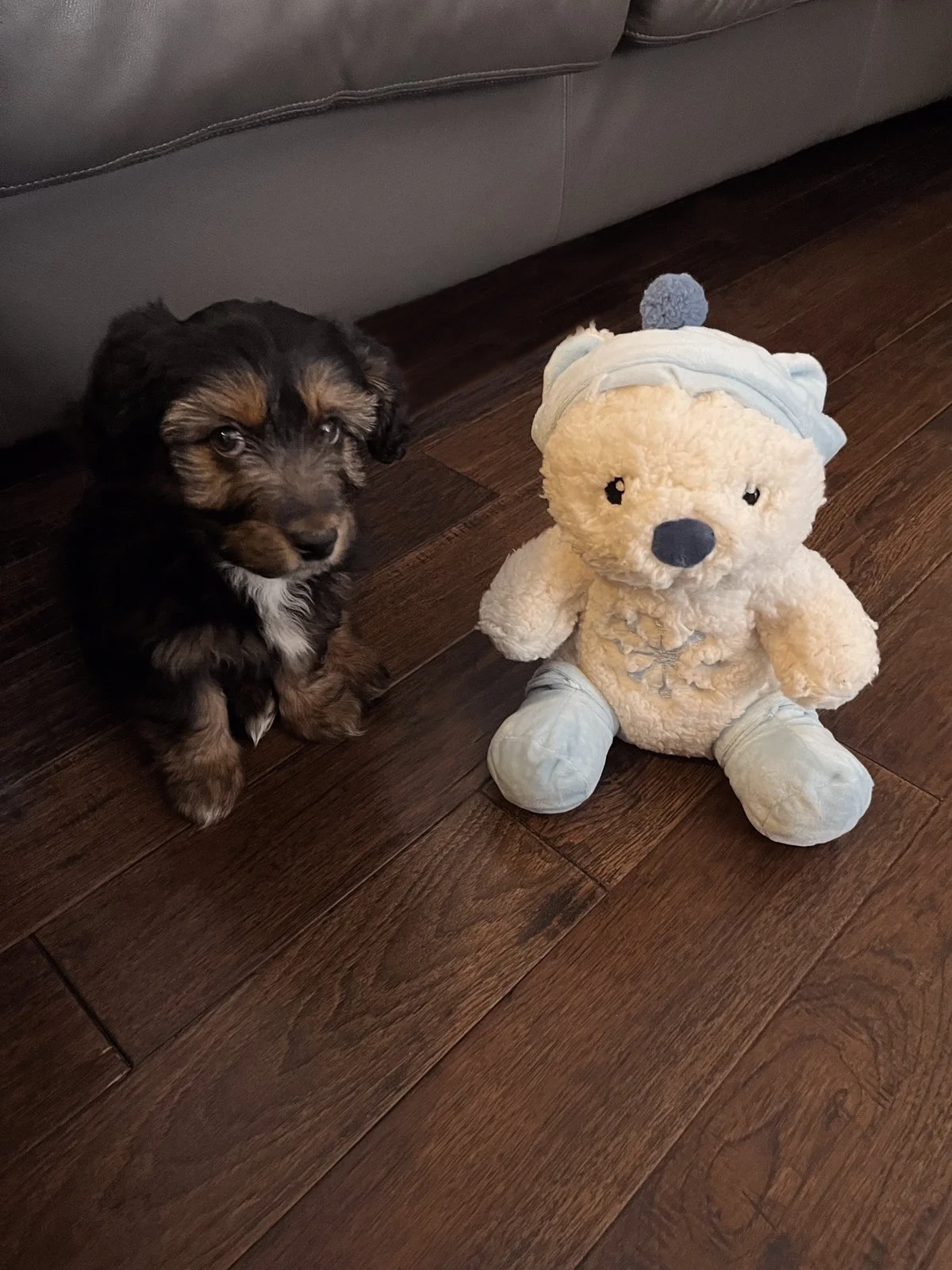 Mocha is a sweet Mini Aussiedoodle puppy with a thoughtful nature and a love for discovery. He enjoys following Sparky on adventures, noticing the little details, and sharing exciting moments with family and friends.